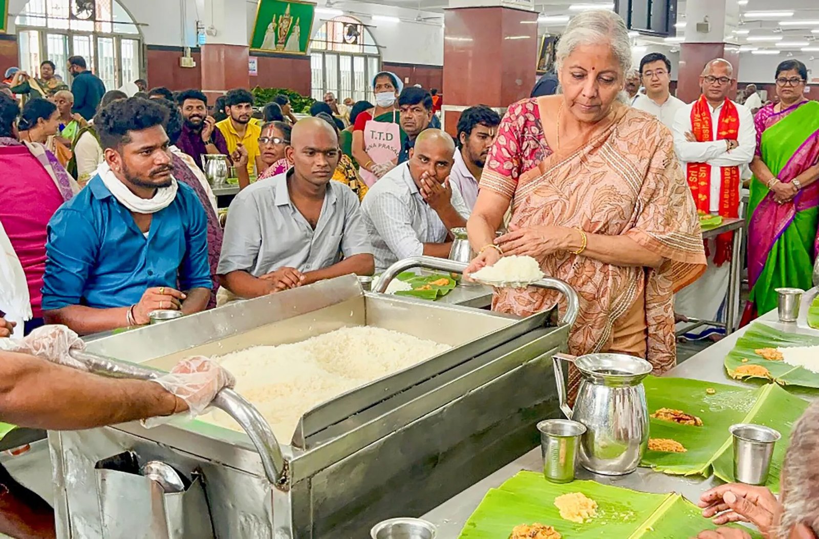 केंद्रीय वित्त मंत्री निर्मला सीतारमण आंध्र प्रदेश के तिरुमाला स्थित वेंगाम्बा अन्नप्रसादम परिसर में श्रद्धालुओं को प्रसाद परोसती हुईं।