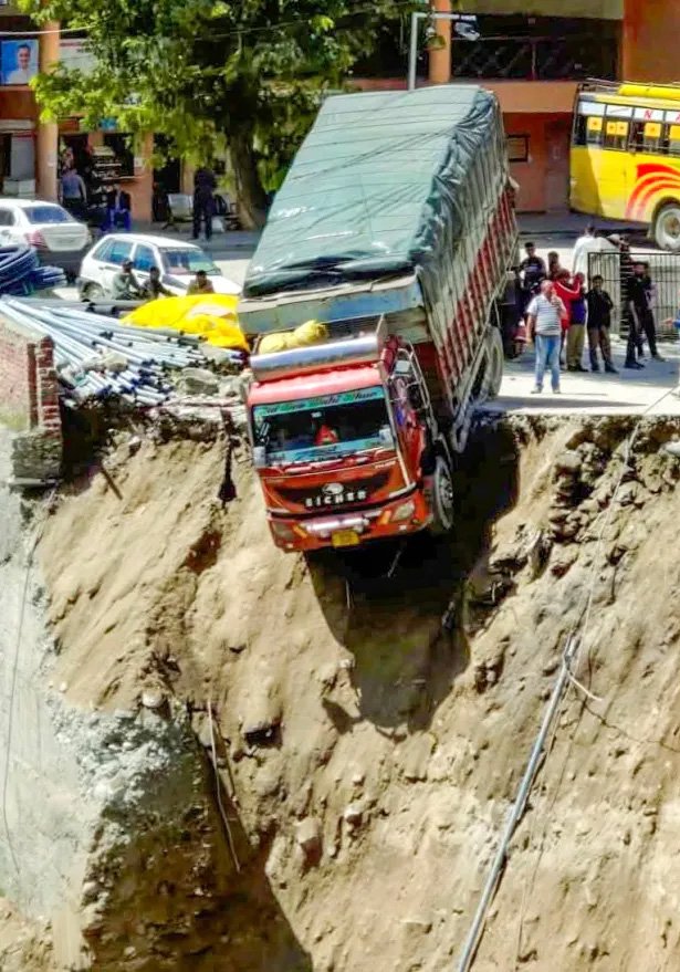 किन्नौर के सांगला बस स्टैंड के पास भूस्खलन प्रभावित क्षेत्र के किनारे पर सेब की पेटियों से भरा एक ट्रक अनिश्चित रूप से लटका हुआ है।