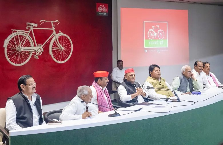 समाजवादी पार्टी (सपा) के राष्ट्रीय अध्यक्ष अखिलेश यादव लखनऊ में मथुरा-वृंदावन, हाथरस और आगरा के लिए ‘स्थानीय घोषणापत्र’ के विमोचन के दौरान संबोधित करते हुए।