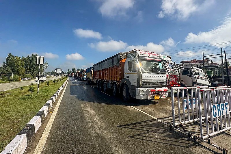 अनंतनाग में लगातार बारिश और भूस्खलन के बाद जम्मू-श्रीनगर राष्ट्रीय राजमार्ग बंद होने के कारण ट्रकों की लंबी कतार लग गई।