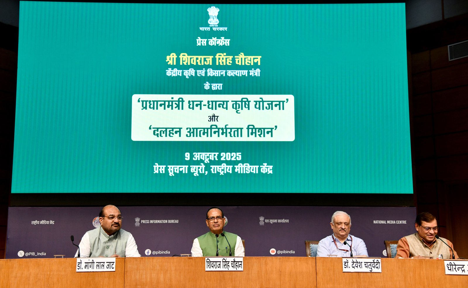 (09कैप्शन13)केंद्रीय कृषि और किसान कल्याण और ग्रामीण विकास मंत्री, श्री शिवराज सिंह चौहान ने नई दिल्ली में राष्ट्रीय मीडिया केंद्र में पीएम धन धन्य योजना आत्मनिर्भरता दलहन मिशन के शुभारंभ और कई परियोजनाओं के उद्घाटन के बारे में मीडिया को जानकारी दी।