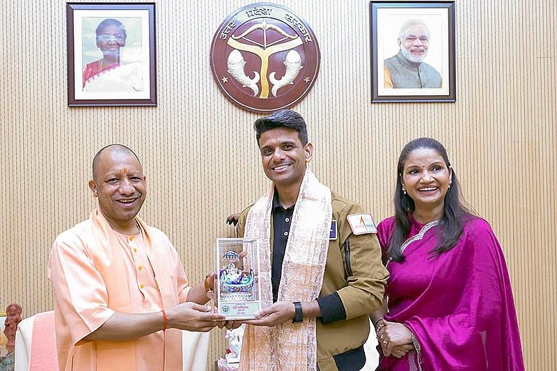 उत्तर प्रदेश के मुख्यमंत्री योगी आदित्यनाथ, लखनऊ में एक्सिओम-4 मिशन के तहत अंतर्राष्ट्रीय अंतरिक्ष स्टेशन (आईएसएस) की अपनी ऐतिहासिक यात्रा के बाद एक बैठक के दौरान ग्रुप कैप्टन शुभांशु शुक्ला और शुभांशु की पत्नी कामना के साथ।