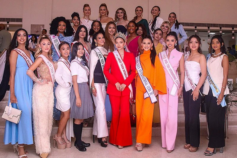 मिस टीन इंटरनेशनल 2025 की प्रतिभागी ग्रेटर नोएडा में एक कार्यक्रम में ग्रुप फोटो के लिए पोज देती हुई।