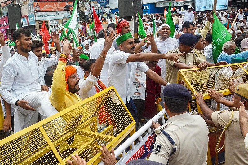 पटना में बिहार के मुख्यमंत्री आवास तक विरोध मार्च के दौरान किसानों ने पुलिस बैरिकेड तोड़ने की कोशिश की।