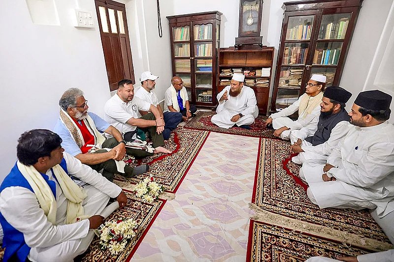 लोकसभा में विपक्ष के नेता राहुल गांधी, राजद नेता तेजस्वी यादव और इंडिया ब्लॉक के अन्य नेता बिहार के मुंगेर में खानक्वाह रहमानी में लोगों के साथ बैठक के दौरान।