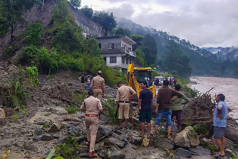 पोस्ट की गई इस तस्वीर में, उत्तराखंड के चमोली जिले में भारी वर्षा के बाद प्रभावित क्षेत्र में खोज और बचाव अभियान के दौरान पुलिस कर्मी और अन्य लोग।