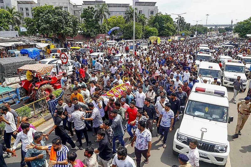 गुजरात के अहमदाबाद में सेवेंथ डे एडवेंटिस्ट स्कूल के सामने अंतिम संस्कार के दौरान मंगलवार को कक्षा 10 के एक छात्र की उसके जूनियर छात्र ने मामूली कहासुनी के बाद कथित तौर पर चाकू मारकर हत्या कर दी थी। परिवार के सदस्य छात्र के पार्थिव शरीर को ले जाते हुए।