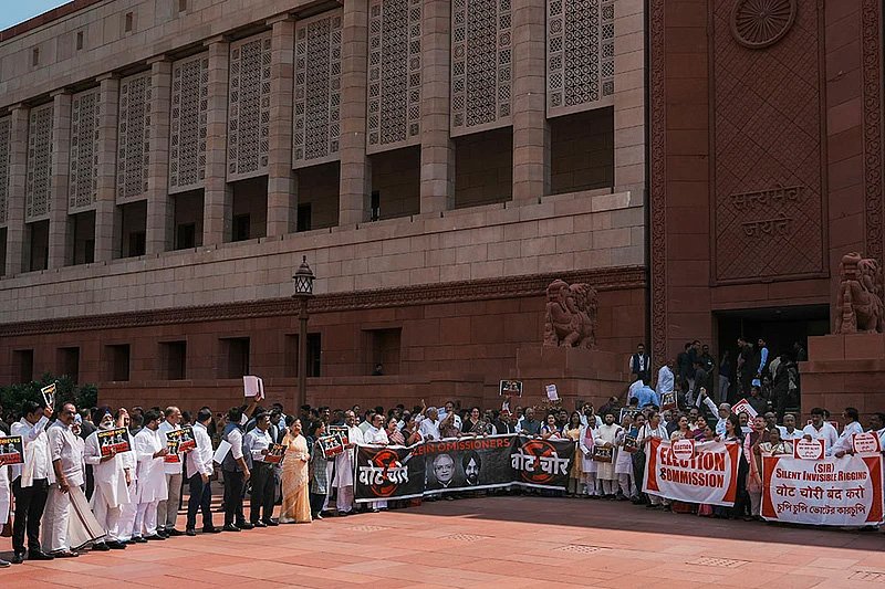 संसद के मानसून सत्र के दौरान, नई दिल्ली में, बिहार में मतदाता सूची के चुनाव आयोग के विशेष गहन पुनरीक्षण (एसआईआर) के खिलाफ विरोध प्रदर्शन में भाग लेते हुए इंडिया ब्लॉक के सांसद।