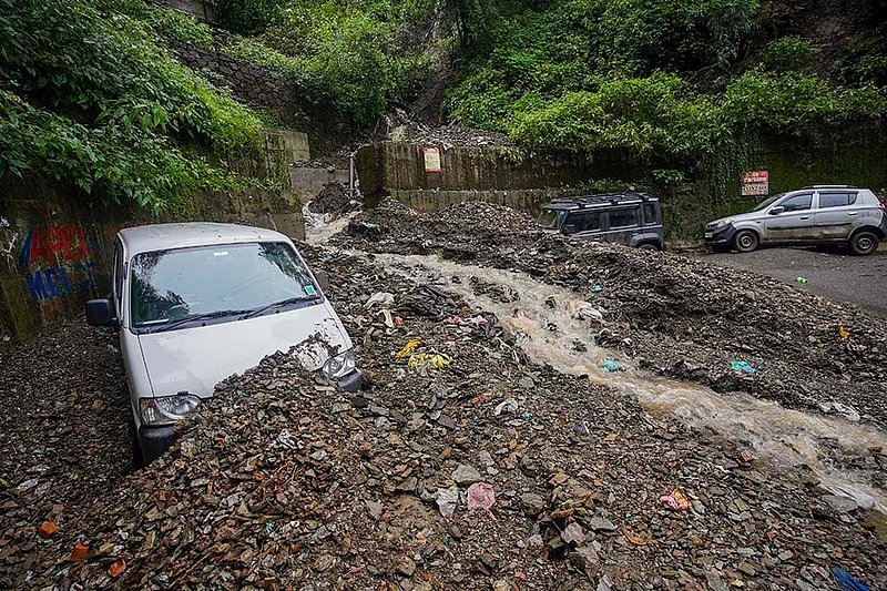 शिमला में भारी बारिश के बाद मलबे में फंसा एक वाहन।