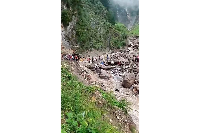 किश्तवाड़ के चशोती क्षेत्र में बादल फटने के बाद अचानक आई बाढ़ के बाद प्रभावित क्षेत्र में जाते लोग।