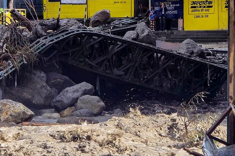 शिमला के रामपुर क्षेत्र में बादल फटने से हुई भारी बारिश के कारण एक पुल ढह गया।