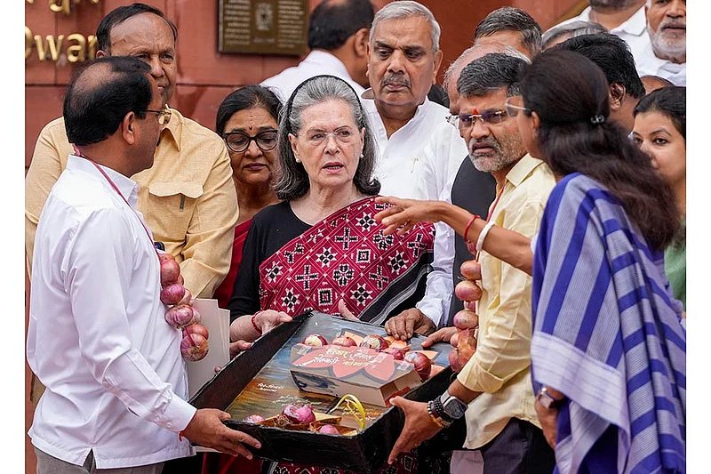 नई दिल्ली में संसद के मानसून सत्र में प्याज के लिए न्यूनतम समर्थन मूल्य (एमएसपी) की मांग को लेकर विरोध प्रदर्शन के दौरान कांग्रेस सांसद सोनिया गांधी, डीएमके सांसद टीआर बालू, एनसीपी (एसपी) सांसद सुप्रिया सुले और अन्य इंडिया ब्लॉक सदस्य।