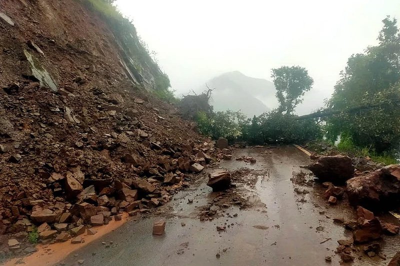 जम्मू-कश्मीर के राजौरी जिले के कंजा में भूस्खलन के बाद उखड़े हुए पेड़ और मलबा कोटरंका-खवास मार्ग को अवरुद्ध कर दिया।