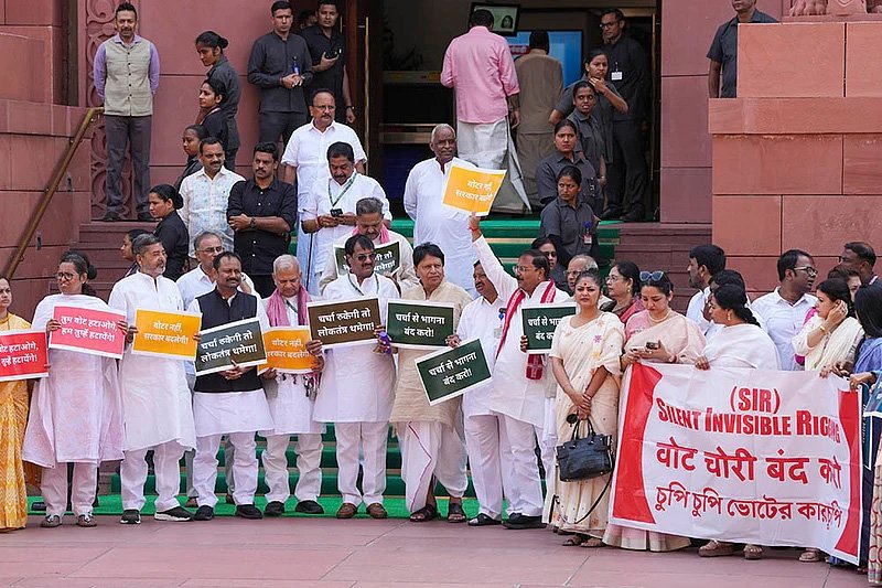 नई दिल्ली में संसद के मानसून सत्र के दौरान बिहार में मतदाता सूची के चुनाव आयोग के विशेष गहन पुनरीक्षण (एसआईआर) के खिलाफ विरोध प्रदर्शन करते हुए टीएमसी सांसद सायोनी घोष, जून मलैया, पीडीए और विपक्षी नेताओं के साथ।