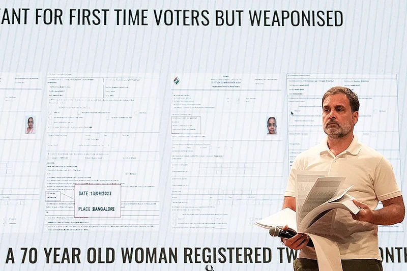 लोकसभा में विपक्ष के नेता और कांग्रेस सांसद राहुल गांधी नई दिल्ली में एआईसीसी मुख्यालय में एक प्रेस कॉन्फ्रेंस के दौरान।