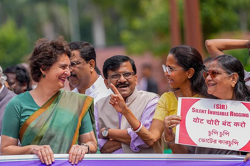कांग्रेस सांसद प्रियंका गांधी वाड्रा, शिवसेना (यूबीटी) सांसद संजय राउत, एनसीपी-एसपी सांसद सुप्रिया सुले और टीएमसी सांसद काकोली घोष दस्तीदार, संसद के मानसून सत्र के दौरान, नई दिल्ली में बिहार में मतदाता सूची के चुनाव आयोग के विशेष गहन पुनरीक्षण (एसआईआर) के खिलाफ विरोध प्रदर्शन करते हुए।