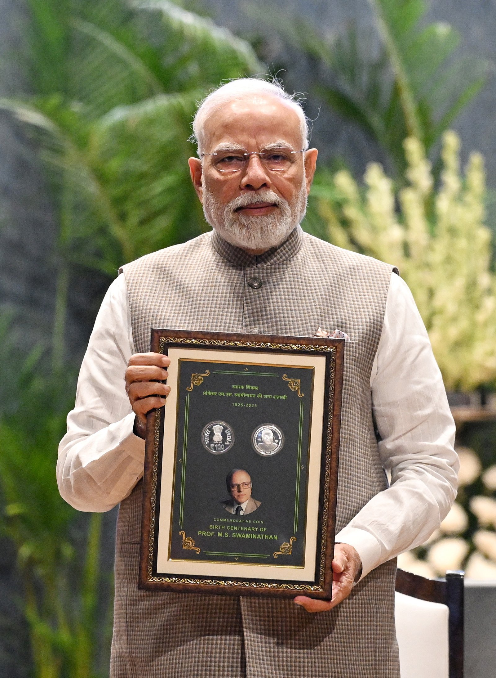 प्रधानमंत्री नरेन्द्र मोदी ने नई दिल्ली में आईसीएआर पूसा में एम.एस. स्वामीनाथन शताब्दी अंतर्राष्ट्रीय सम्मेलन के उद्घाटन के दौरान एम.एस. स्वामीनाथन की जन्म शताब्दी के उपलक्ष्य में स्मारक सिक्का जारी किया।