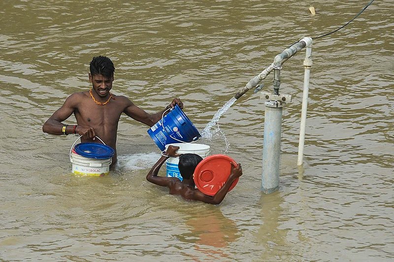 पटना में मानसून के मौसम में गंगा नदी के उफान पर होने के कारण आसपास के इलाकों में जलभराव की स्थिति के कारण लोग बिंद टोली इलाके में हैंडपंप से पीने का पानी इकट्ठा करते हुए।
