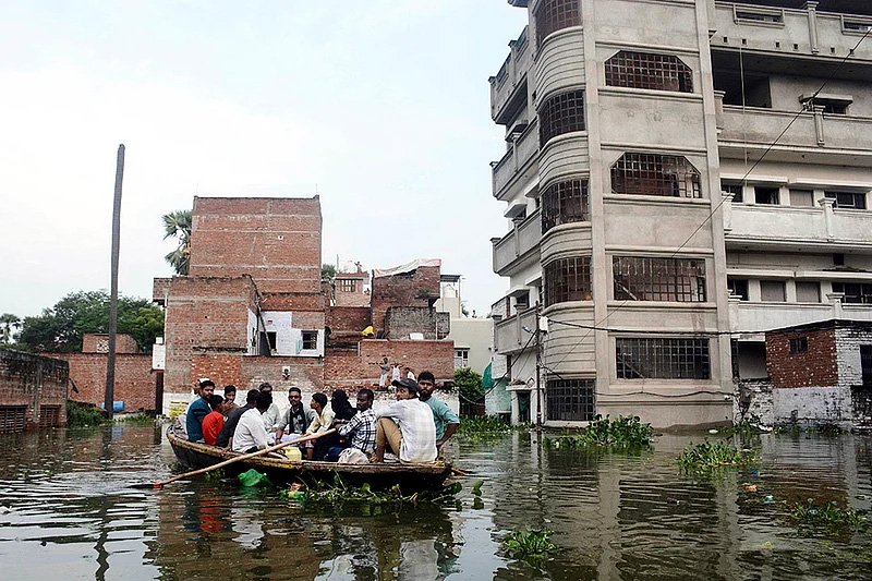 वाराणसी में बाढ़ प्रभावित क्षेत्र में आवागमन के लिए लोग नाव का उपयोग करते हुए ।