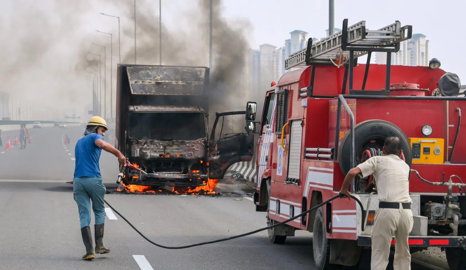 गुरुग्राम-द्वारका एक्सप्रेसवे पर बसई चौक पर फ्लाईओवर पर एक ट्रक में आग लगने के बाद एक दमकलकर्मी आग बुझाने की कोशिश करता हुआ ।