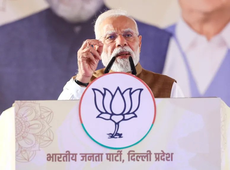 प्रधानमंत्री नरेंद्र मोदी नई दिल्ली में दिल्ली भाजपा कार्यालय के उद्घाटन के दौरान उपस्थित जनसमूह को संबोधित करते हुए।
