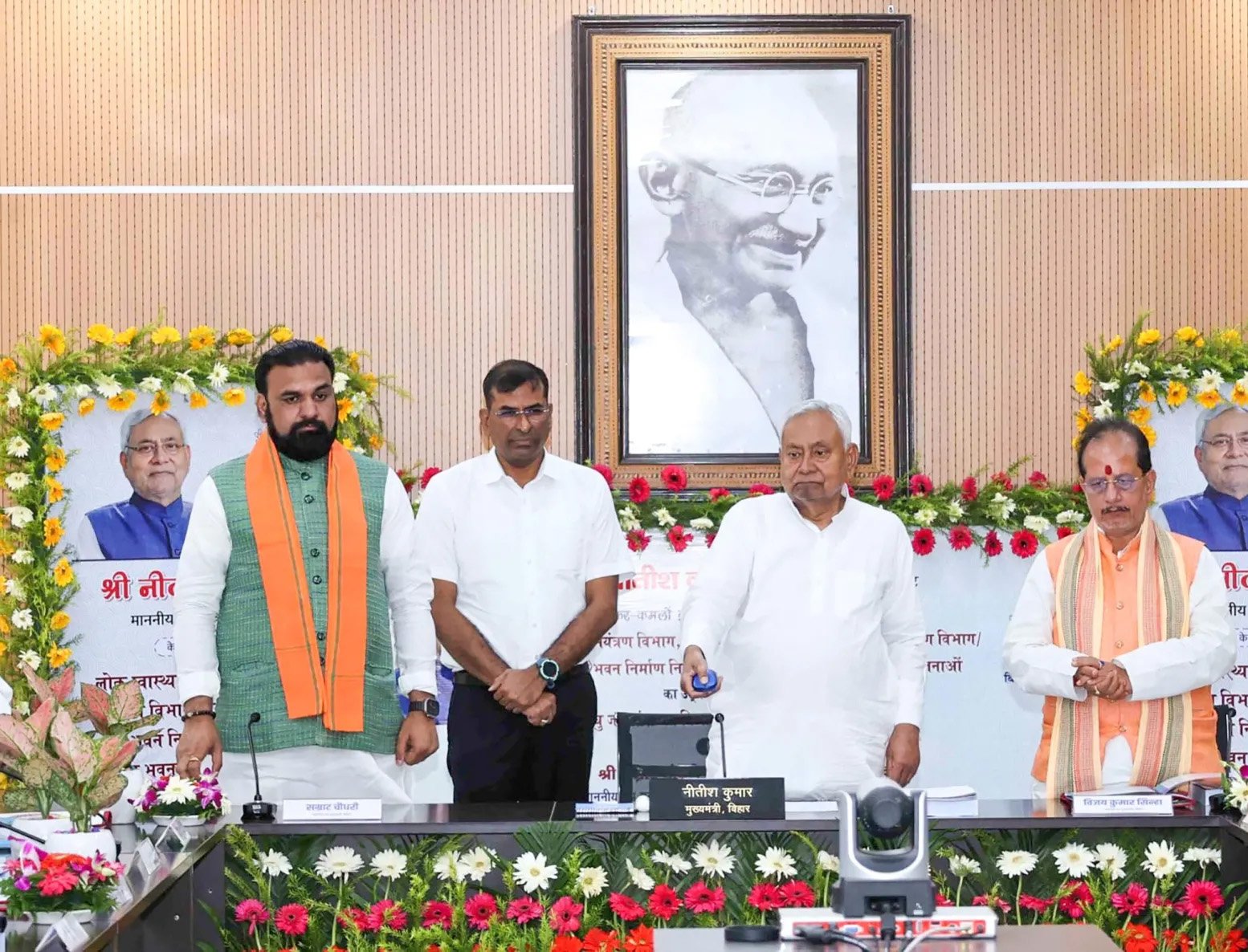 बिहार के मुख्यमंत्री नीतीश कुमार, उपमुख्यमंत्री सम्राट चौधरी और विजय कुमार सिन्हा के साथ पटना में विभिन्न विकास परियोजनाओं का उद्घाटन और शिलान्यास करते हुए।