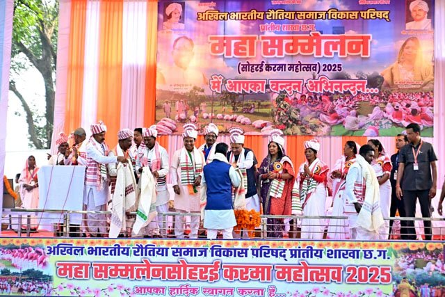 हेलीपैड पर पारंपरिक करमा नर्तक दलों ने उत्साहपूर्वक नृत्य प्रस्तुत कर मुख्यमंत्री का अभिनंदन किया और मनमोहक करमा नृत्य करते हुए उन्हें भव्य स्वागत के साथ कार्यक्रम स्थल तक लेकर गए।