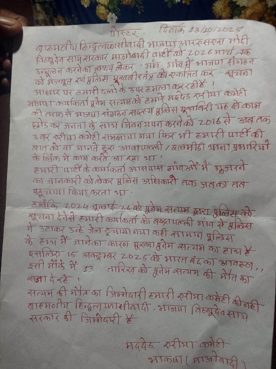 मिली जानकारी के अनुसार भाजपा के मंडल कार्यकर्ता के रूप में सक्रिय पूनम सत्यम को नक्सलियों ने मुखबिरी के आरोप में मौत के घाट उतार दिया। घटना स्थल से पुलिस को एक पर्चा भी मिला है, जिसमें हत्या की वजहों का उल्लेख करते हुए नक्सलियों ने लिखा है कि काफी दिनों से उसे टारगेट पर रखा गया था, कई बार समझाइश दी गई, लेकिन उसने बात नहीं मानी। पर्चे में मद्देड एरिया कमेटी ने इस हत्या की जिम्मेदारी ली है और इसे जन कार्रवाई बताया है। घटना की सूचना मिलते ही पुलिस और सुरक्षा बल मौके की ओर रवाना हो गए हैं। इलाके में दहशत का माहौल है। मृतक पूनम सत्यम भाजपा की मंडल इकाई में सक्रिय था और पिछले कुछ महीनों से पार्टी गतिविधियों में लगातार हिस्सा ले रहा था।