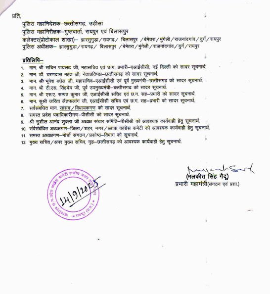 16 से 18 सितंबर: वोट चोर गद्दी छोड़ो अभियान के अंतर्गत विभिन्न स्थानों पर तैयारियों का निरीक्षण एवं जनसभाओं में भागीदारी। 17 व 18 सितंबर: मुंगेली, बैकुंठपुर, राजनांदगांव, दुर्ग, भिलाई और मिलाई में पदयात्रा, सभा एवं मोटर साइकिल रैली का आयोजन। 19 सितंबर: रायपुर में स्थानीय कार्यक्रम में भाग लेने के उपरांत दिल्ली के लिए प्रस्थान। कांग्रेस पार्टी की यह व्यापक मुहिम आगामी विधानसभा चुनावों की रणनीति का हिस्सा मानी जा रही है। पार्टी नेतृत्व द्वारा इस अभियान को गांव-गांव तक पहुंचाने का लक्ष्य रखा गया है।