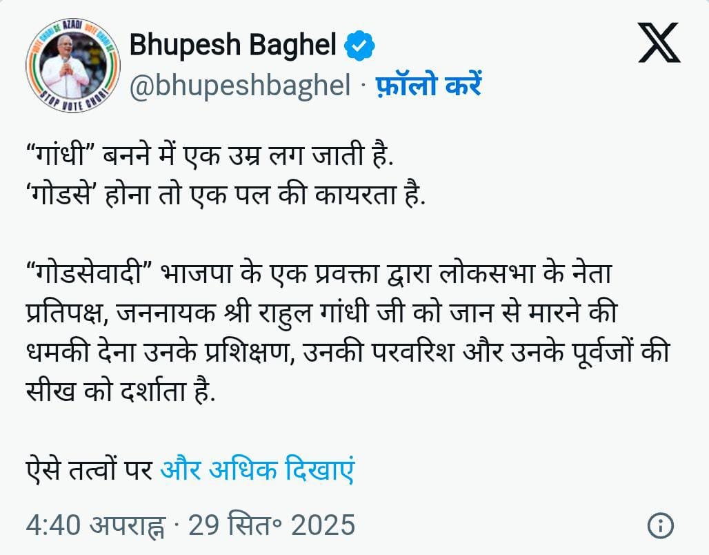 रायपुर, 29 सितम्बर (आरएनएस)। छत्तीसगढ़ की राजधानी रायपुर में उस वक्त सियासी हलचल तेज हो गई जब एक लाइव टीवी शो के दौरान *भाजपा प्रवक्ता पिंटू महादेव* द्वारा विपक्ष के नेता *राहुल गांधी* को लेकर की गई कथित गोली मारने की टिप्पणी पर विवाद खड़ा हो गया। इस बयान के बाद कांग्रेस समेत कई विपक्षी दलों ने तीखी प्रतिक्रिया दी है और इस बयान को बेहद आपत्तिजनक और खतरनाक बताया है। इस मामले को लेकर रविवार को *बड़ी संख्या में कांग्रेस कार्यकर्ता सिविल लाइन थाना* पहुंचे और भाजपा प्रवक्ता के खिलाफ एफआईआर दर्ज कराने की मांग की। कांग्रेस नेताओं ने चेतावनी दी कि यदि कार्रवाई नहीं होती तो वे लगातार थाने पहुंचते रहेंगे और बड़े स्तर पर प्रदर्शन करेंगे। कांग्रेस ने जताई कड़ी आपत्ति पूर्व विधायक *विकास उपाध्याय* ने कहा कि यह टिप्पणी बेहद दुर्भाग्यपूर्ण है, खासकर तब जब राहुल गांधी एक संवैधानिक पद पर हैं और उनके परिवार में पहले ही दो बड़ी राजनीतिक हत्याएं हो चुकी हैं। उन्होंने कहा कि भाजपा की विचारधारा नाथूराम गोडसे जैसी सोच से जुड़ी है, और यह बयान उसी मानसिकता का परिचायक है। उन्होंने बताया कि कांग्रेस ने शहर जिला कांग्रेस कमेटी अध्यक्ष *गिरीश दुबे* के नेतृत्व में थाना प्रभारी को ज्ञापन सौंपा है और स्पष्ट किया है कि जब तक एफआईआर दर्ज नहीं होती, आंदोलन जारी रहेगा। भूपेश बघेल का तीखा हमला पूर्व मुख्यमंत्री *भूपेश बघेल* ने सोशल मीडिया पर प्रतिक्रिया देते हुए लिखा, गांधी बनने में उम्र लग जाती है, गोडसे होना एक पल की कायरता है। उन्होंने भाजपा पर आरोप लगाया कि पार्टी ऐसे विचारों को संरक्षण दे रही है और गोडसेवादी सोच को बढ़ावा मिल रहा है। राष्ट्रीय नेताओं की प्रतिक्रियाएं कांग्रेस प्रवक्ता *सुप्रिया श्रीनेत* ने भाजपा प्रवक्ता के बयान को चौंकाने वाला बताया और राहुल गांधी की सुरक्षा को लेकर गहरी चिंता जताई। उन्होंने कहा कि अगर राष्ट्रीय टेलीविजन पर विपक्ष के नेता को गोली मारने की बात कही जा रही है, तो यह बेहद गंभीर मामला है। वहीं कांग्रेस सांसद *इमरान प्रतापगढ़ी* ने केंद्र सरकार पर सवाल उठाते हुए पूछा कि क्या राहुल गांधी की हत्या की साजिश रची जा रही है? उन्होंने कहा कि भाजपा नेताओं की लगातार आ रही धमकियां देश के लोकतंत्र के लिए खतरा हैं। कांग्रेस नेता *पवन खेड़ा* ने भी आरोप लगाया कि जब भाजपा वैचारिक रूप से कमजोर पड़ती है, तो वह हिंसा का रास्ता अपनाती है। उन्होंने कहा कि यह बयान लोकतांत्रिक मूल्यों के खिलाफ है और सरकार को तुरंत कार्रवाई करनी चाहिए।