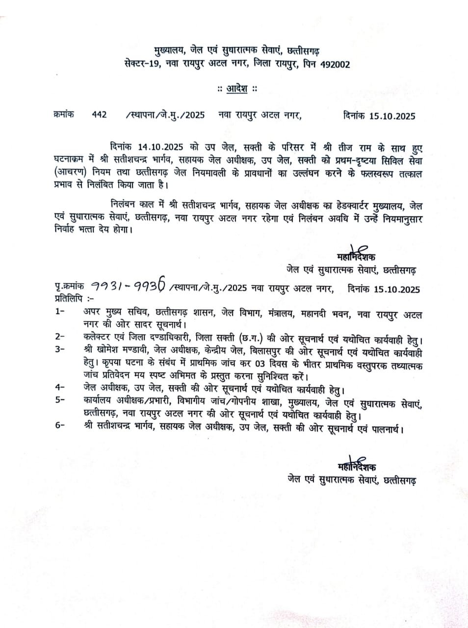 जेल एवं सुधारक सेवाएं के महानिदेशक द्वारा जारी निलंबन आदेश में कहा गया है कि प्रारंभिक जांच में सतीश चंद्र भार्गव द्वारा सिविल सेवा आचरण नियमों के उल्लंघन के संकेत मिले हैं। इसके चलते उन्हें रायपुर स्थित जेल एवं सुधारक सेवाएं महानिदेशक कार्यालय में अटैच किया गया है।